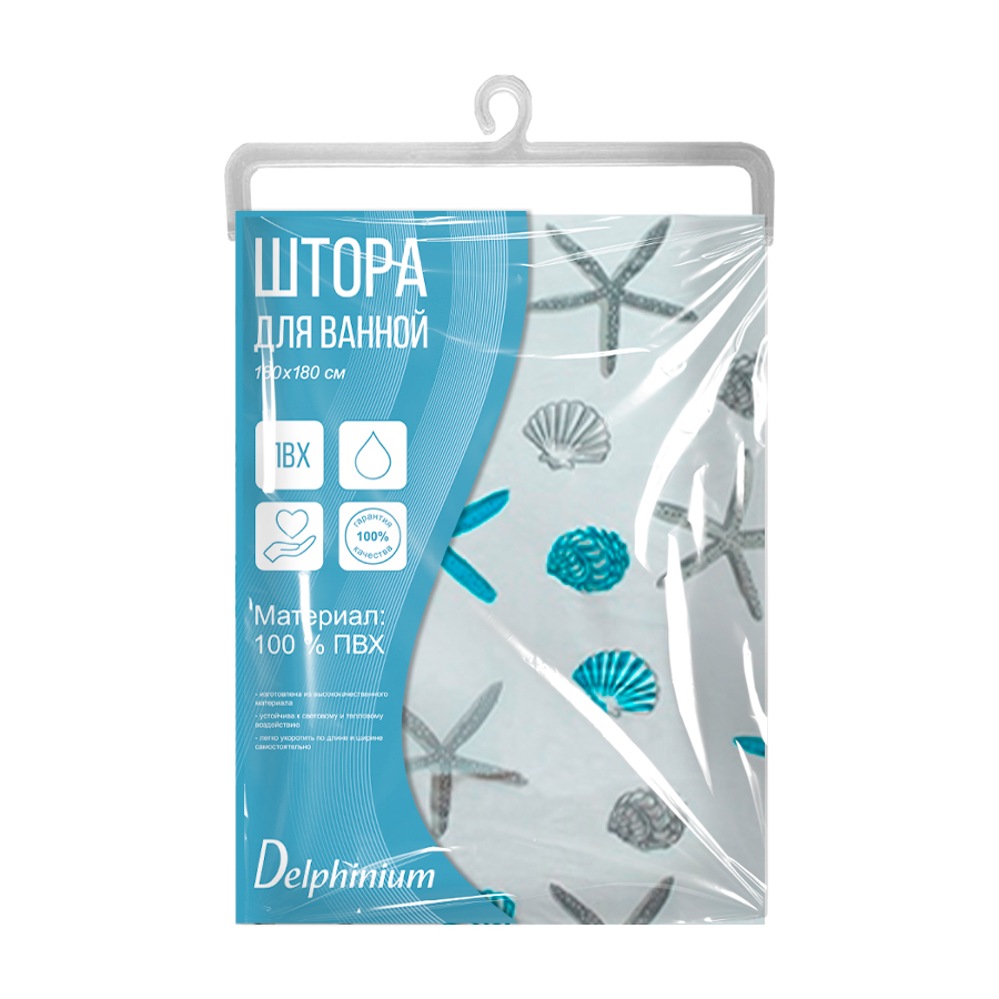Штора для ванной Delphinium "Ракушки" ПВХ 180х180см, 12 колец, голубой