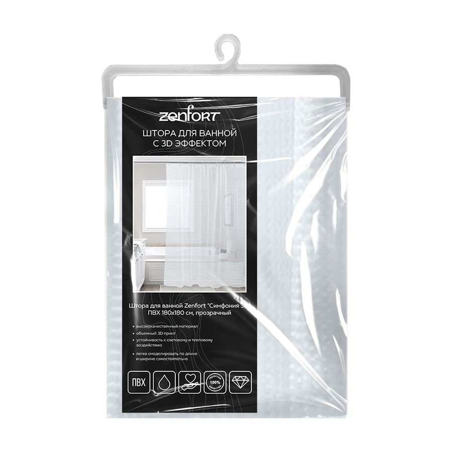 Штора для ванной Zenfort "Симфония 3D" ПВХ 180х180см, 12 колец, прозрачный
