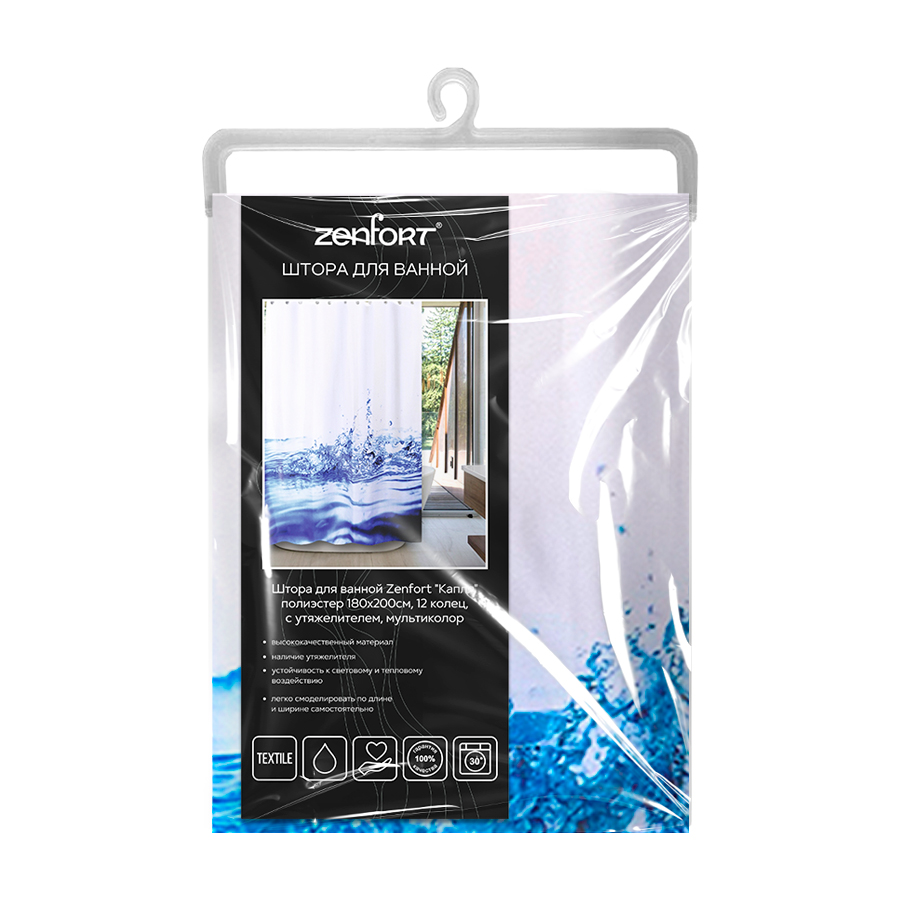 Штора для ванной Zenfort "Капля" полиэстер 180х200см, 12 колец, с утяжелителем, мультиколор