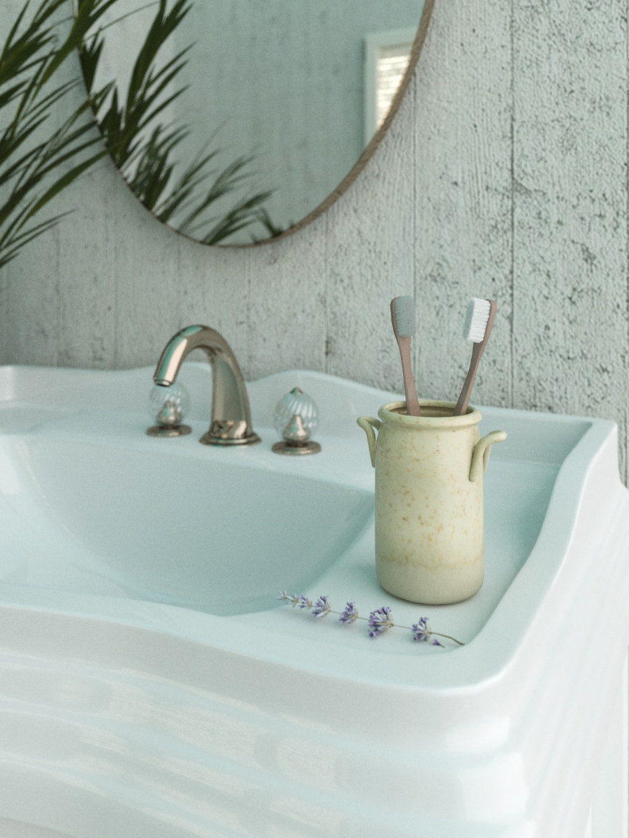 Стакан для зубных щеток выполнен из керамики, имеет необычную форму кувшина с маленькими ручками. Диаметр 10,3 см, высота 11 см. Объем 270мл.