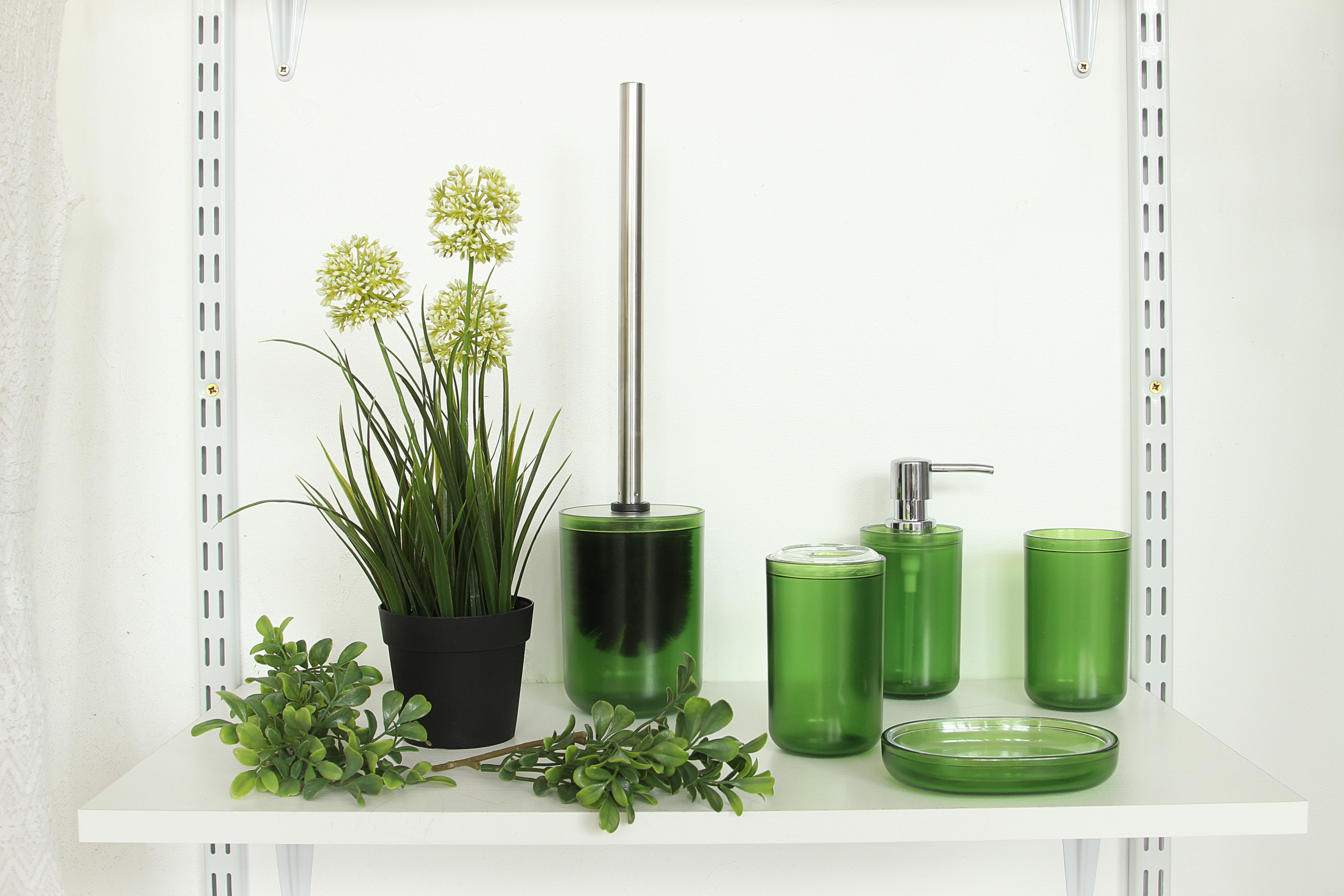 В состав коллекции "Green" входят: дозатор для жидкого мыла, стаканы, мыльница и ёршик для унитаза.