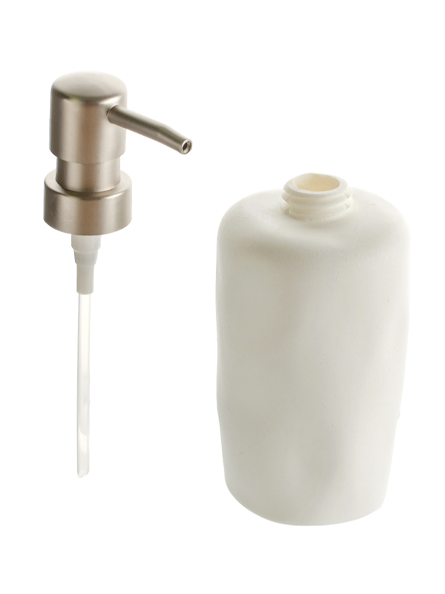 Дозатор цилиндрической формы с фактурной поверхностью предназначен для порционной подачи мыла, шампуней и других гелеобразных жидкостей. Подача моющего средства осуществляется с помощью пластиковой хромированной помпы.