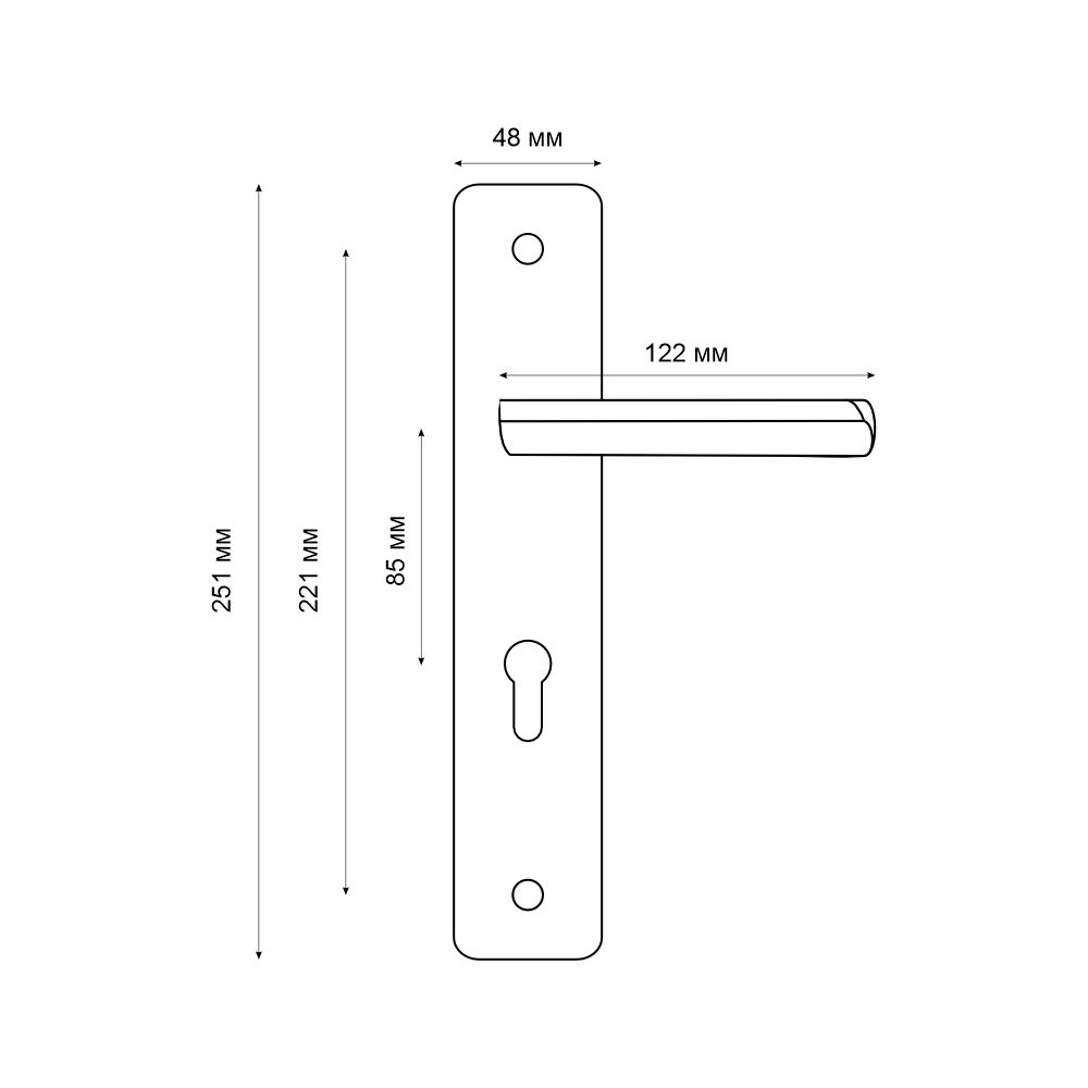 ОписаниеКомплект ручек на планке Vrata предназначен для установки на межкомнатные и входные двери с корпусом замка под цилиндр (межосевое расстояние 85 мм).