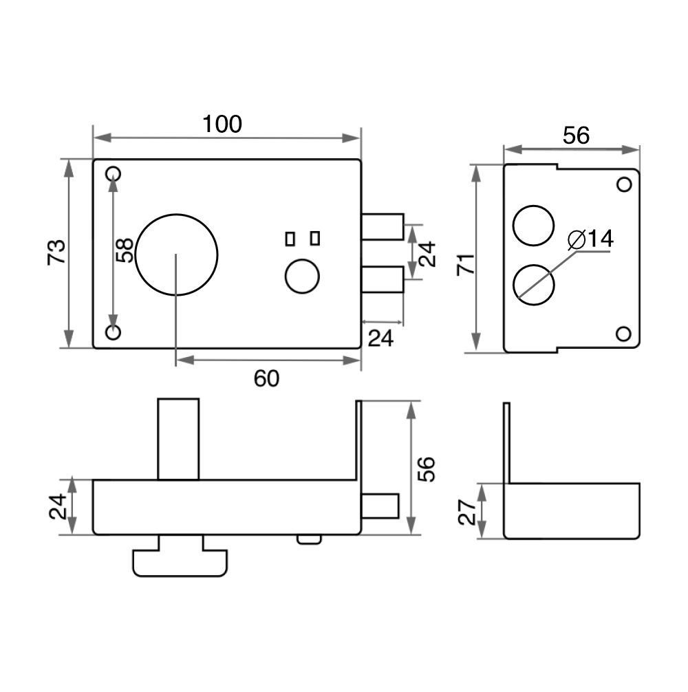 ОписаниеНакладной замок с двумя цилиндрическими ригелями без защелки