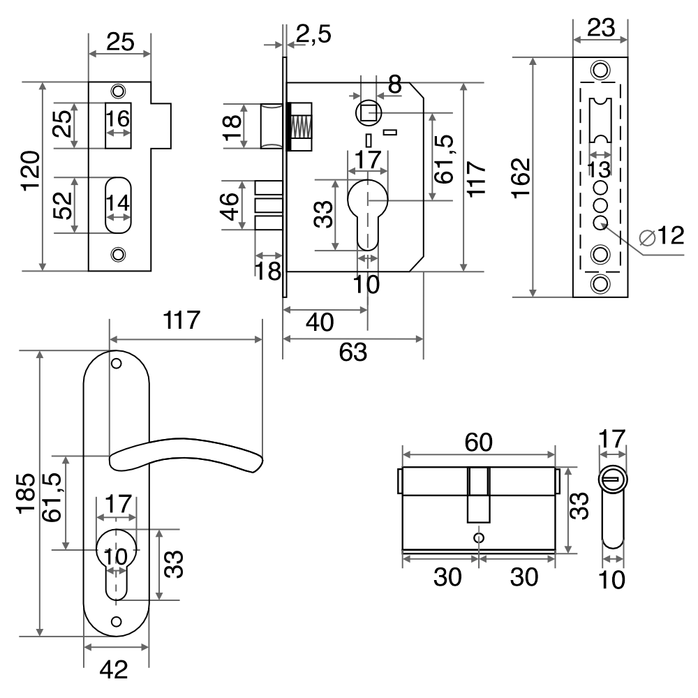 ОписаниеКомплект замка предназначен для установке на деревянные межкомнатные и входные двери с межосевым расстоянием 61,5 мм