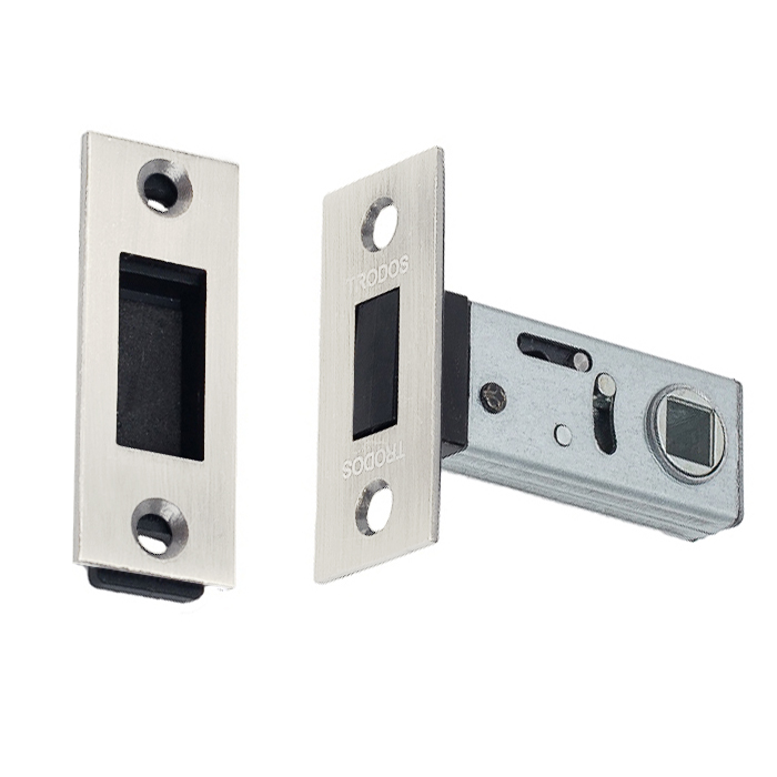 Принцип работы магнитной защелки аналогичен работе механизмов со стальным и пластиковым ригелями, главное преимущество – бесшумная работа.